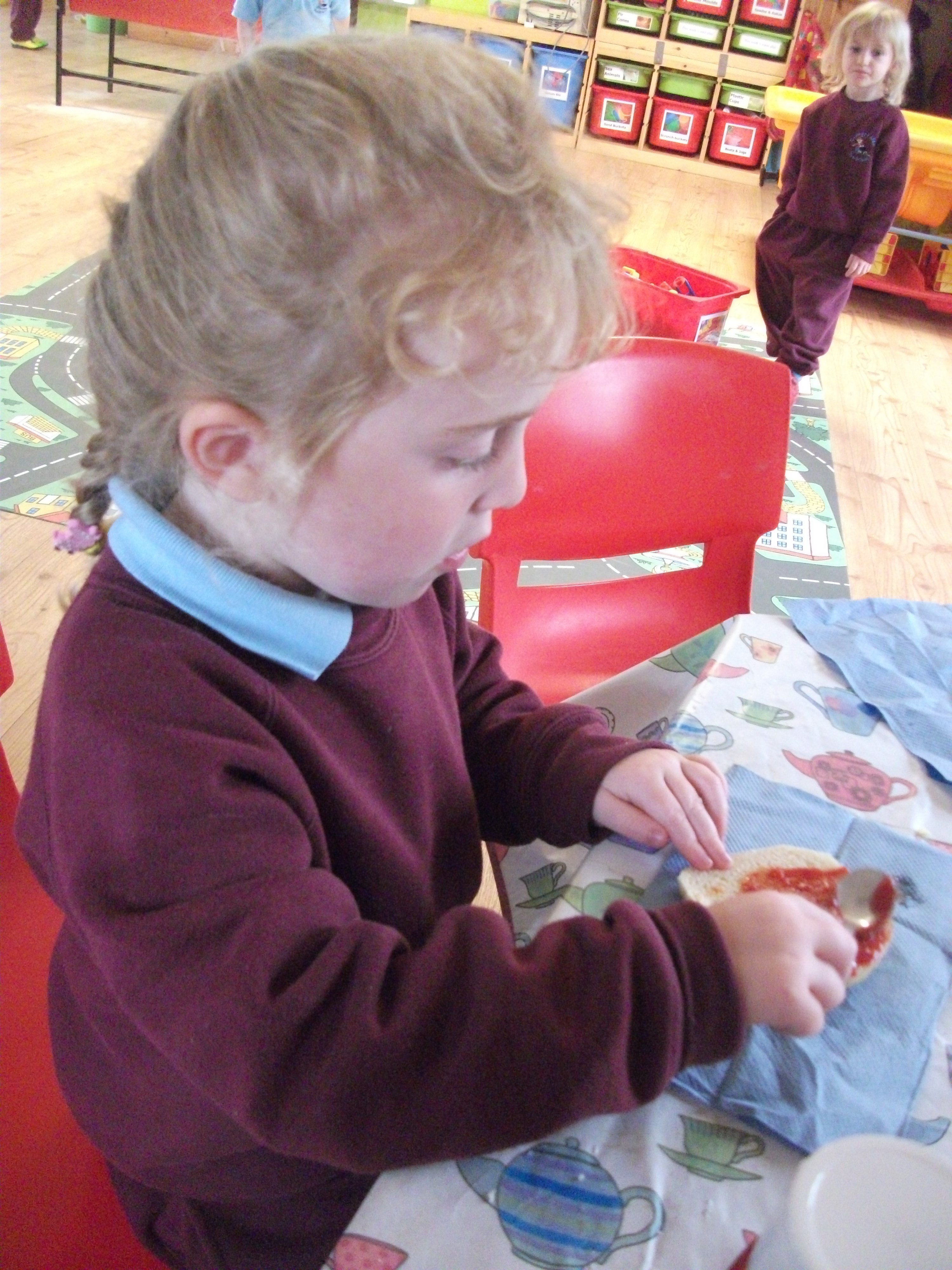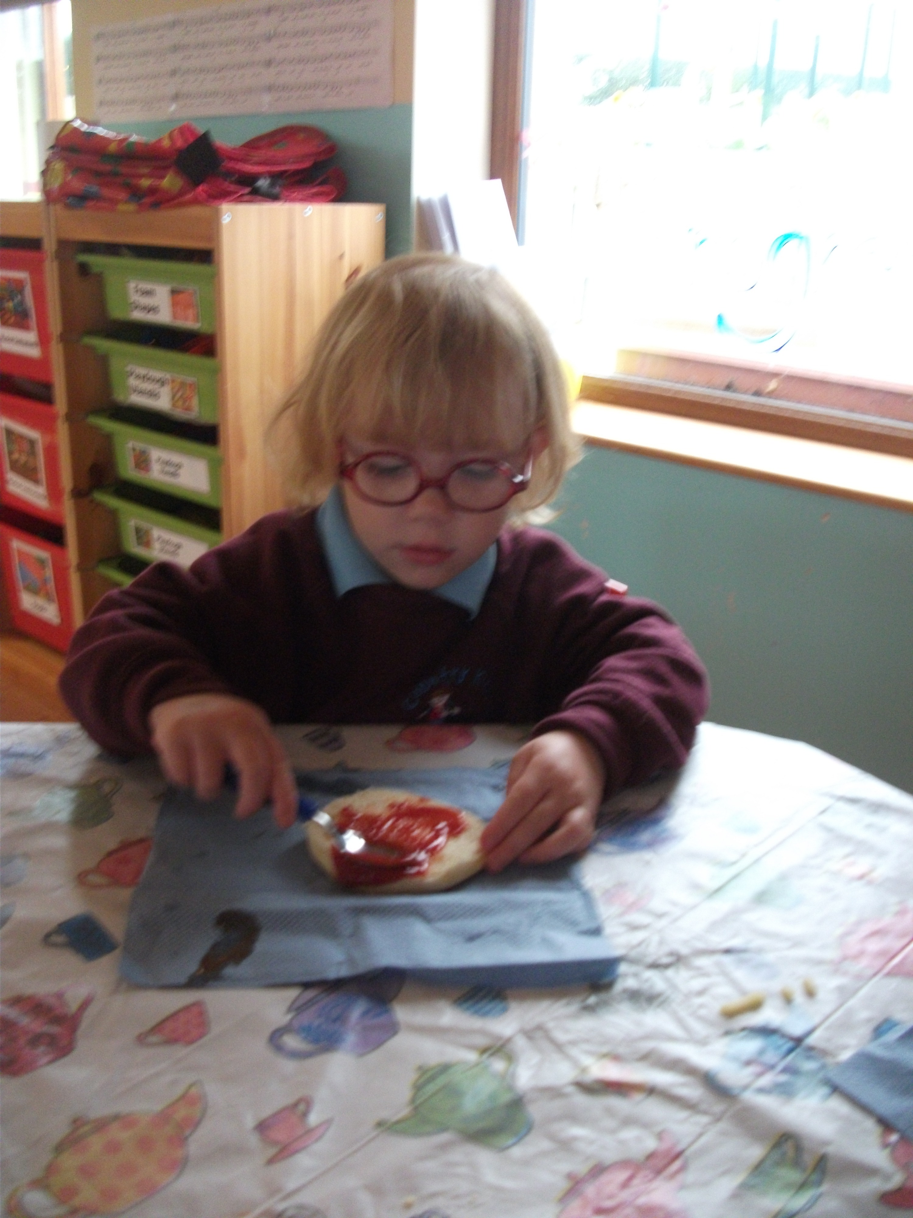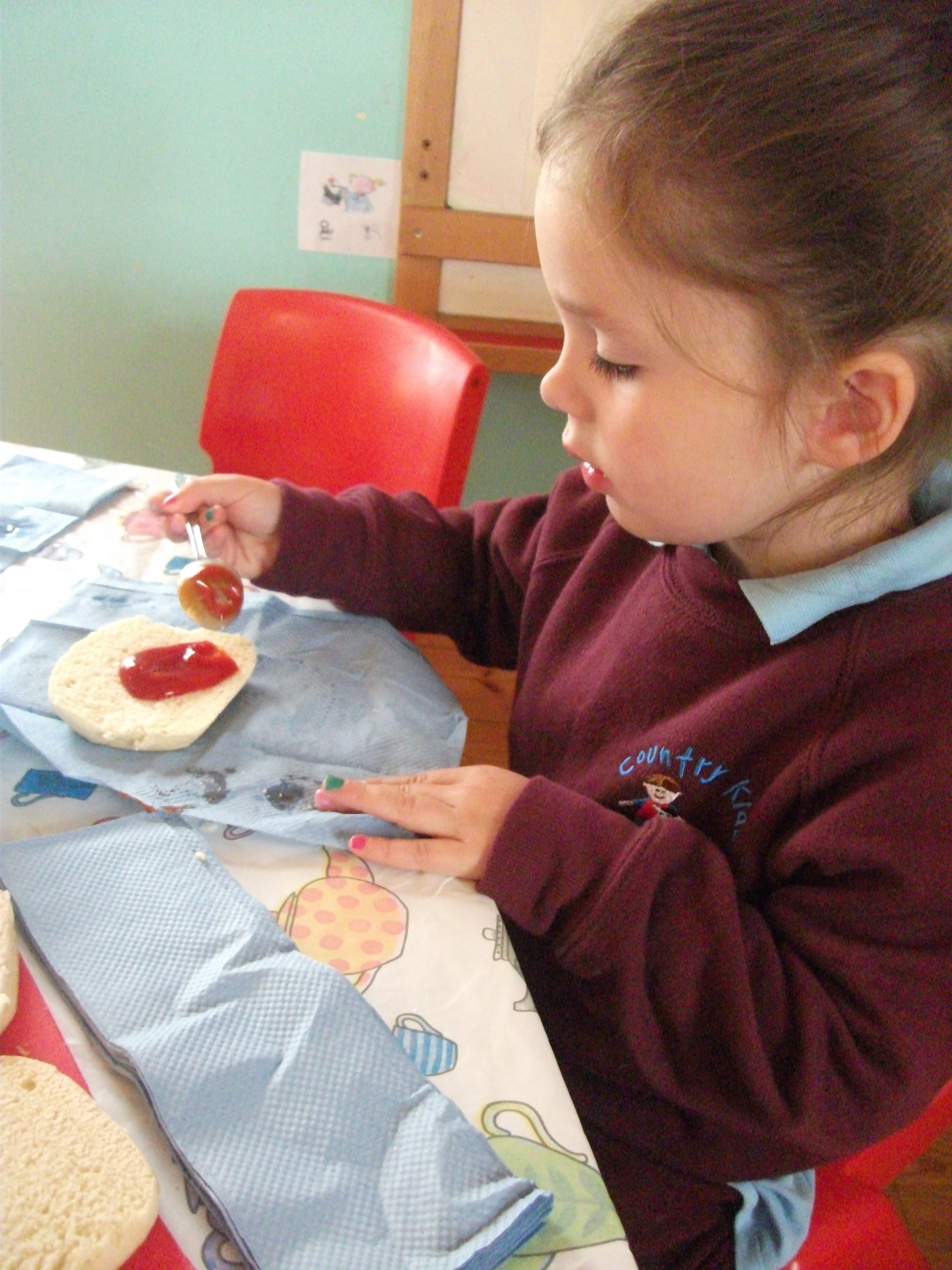 There was lot’s of concentration going into the task as they spread the tomato over their muffin base. They then had the tough decision of choosing where they thought each piece should go! Carefully does it as they each placed the cheese strands for hair, the peppers for wiggly eyebrows, pepperoni for ears, tomatoes for eyes and ham for their pink lips!!